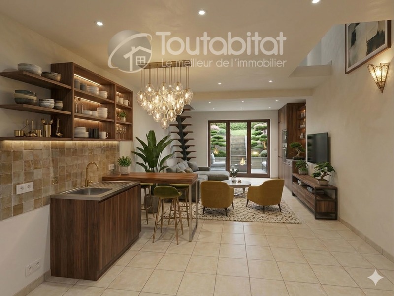 Au rez-de-chaussée, vous découvrirez une belle pièce de vie comprenant un salon et une salle à manger, ainsi qu’une cuisine ouverte aménagée, idéale pour partager des moments conviviaux.