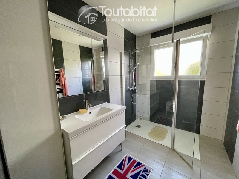Le bien développe une surface habitable d’environ 138 m². Le rez-de-chaussée offre un véritable confort de plain-pied, avec une vaste pièce de vie lumineuse de 60 m² regroupant salon, séjour et cuisine. Ce niveau comprend également deux chambres ainsi qu’une salle d’eau équipée d’une douche à l’italienne.