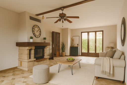 Un séjour spacieux et lumineux de 40 m², agrémenté d’un poêle à bois,